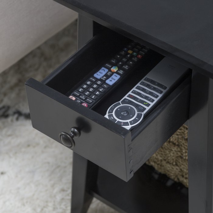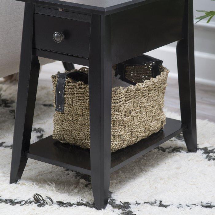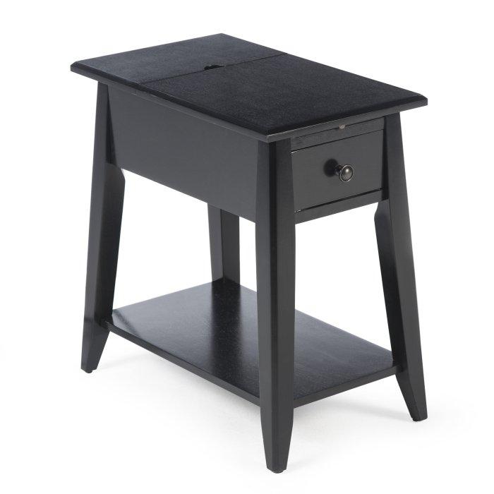 Stylish, convenient, and ultra-functional, the Chairside Table with Power Outlet offers a top that opens to reveal two outlets and two USB ports. Crafted of wood, this piece also features a drawer for storage, a lower shelf, and a sleek black finish. Perfect for placement next to your favorite seat.