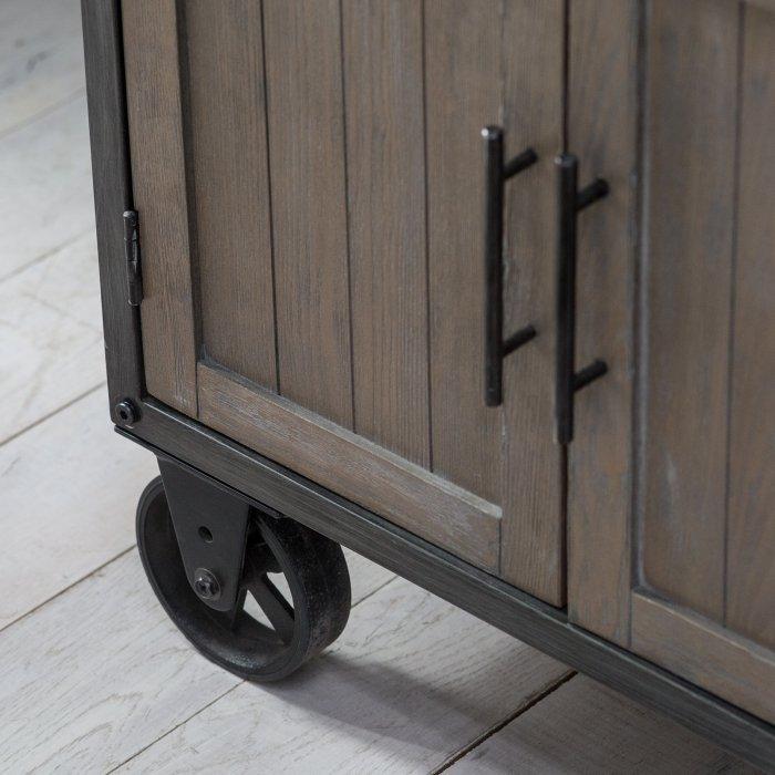 Take your style on the road with this Industrial Bar Cart. Its pre-prohibition design is perfectly enhanced with modern bar-friendly features. A guard rail keeps your top shelf liquor bottles in check, both above and below. A distressed wood cabinet opens to reveal a slatted shelf and solid shelf. A wine-glass rack holds up to 12 glasses, and a reversible wine shelf holds up to six bottles of your favorite beverage. Overscaled metal warehouse-style casters complete the look.