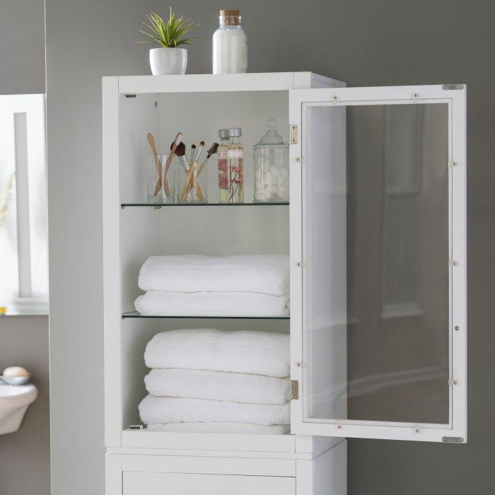 Clean linens, clean lines - that's the story, in a nutshell, of the Modern Linen Tower. Crafted with durable engineered wood and solid hardwood, this tall storage unit boasts an upper cabinet that opens to two adjustable glass shelves. The cabinet door features a clear tempered glass panel so you can see what's inside.