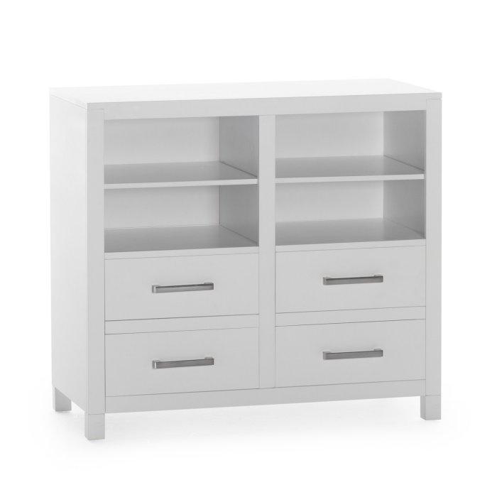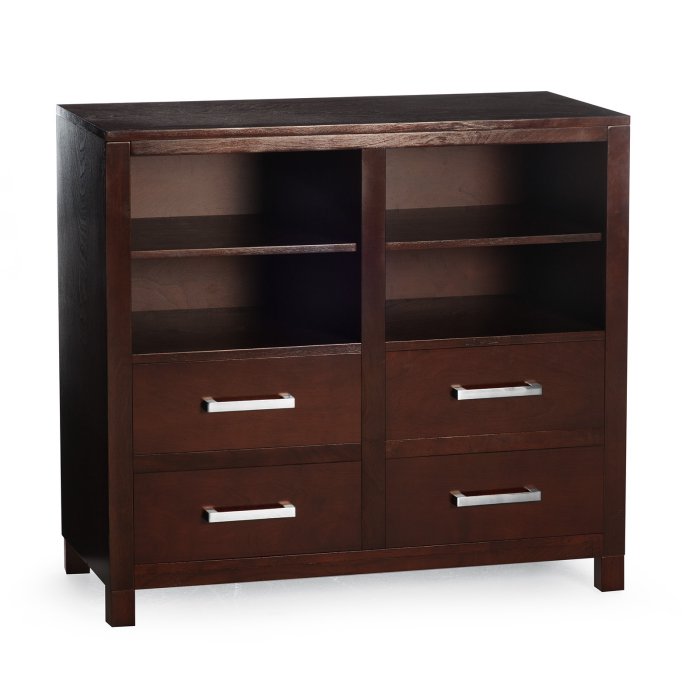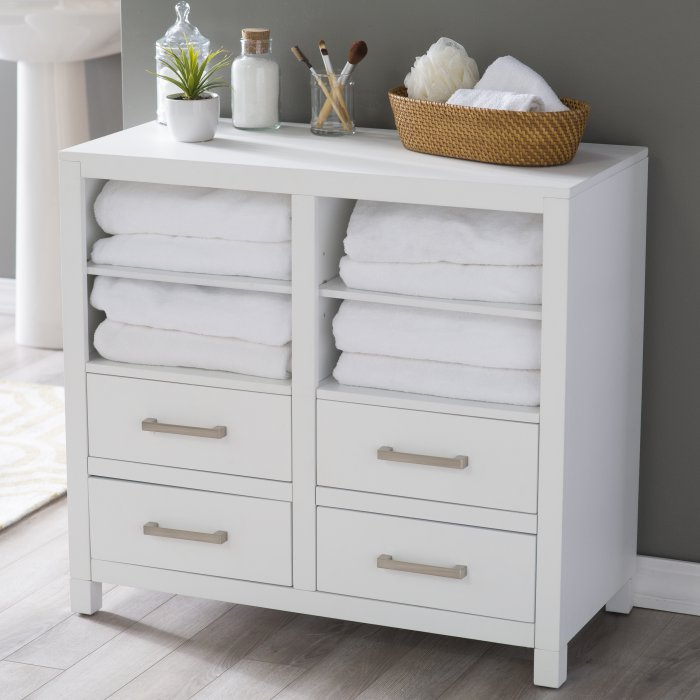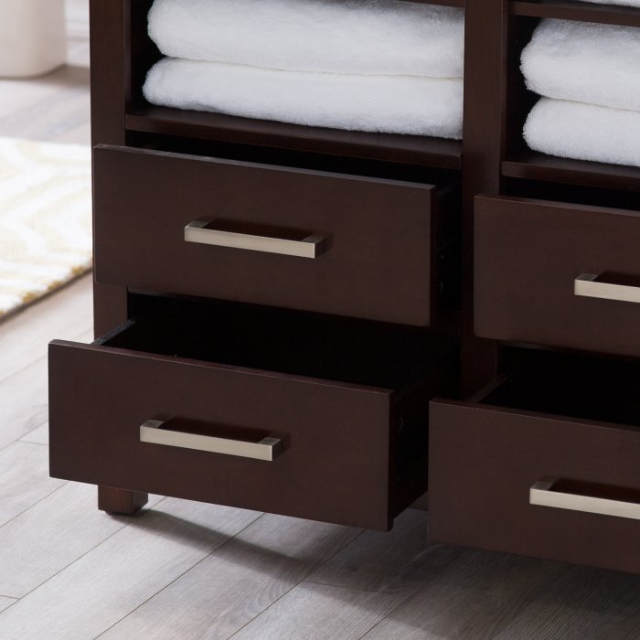 Keep fresh linens, paper products, and toiletries clean and close-at-hand in this Bathroom Floor Cabinet. Crafted with durable MDF and solid hardwood (some color options with birch veneers), this small-scale storage unit boasts four open shelves - two of them adjustable - for towels and washcloths. Beneath, four drawers offer spots to stash styling tools and toiletries. Contemporary brushed nickel hardware throughout complements the sleek finish of your choice. Assembly required.