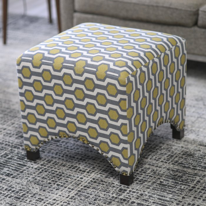 An arched frame and unique patterns make the Printed Nailhead Ottoman a strong, functional style statement in any setting. Its wood frame is covered in your choice of upholstery and is accented with classic nailhead trim. Ideal for anyone looking for a fashionable, versatile piece for their well-appointed home.