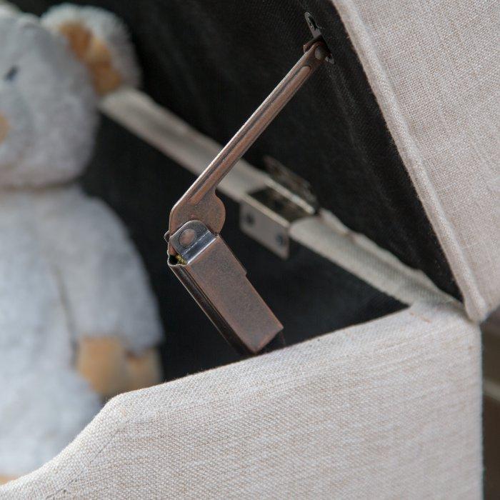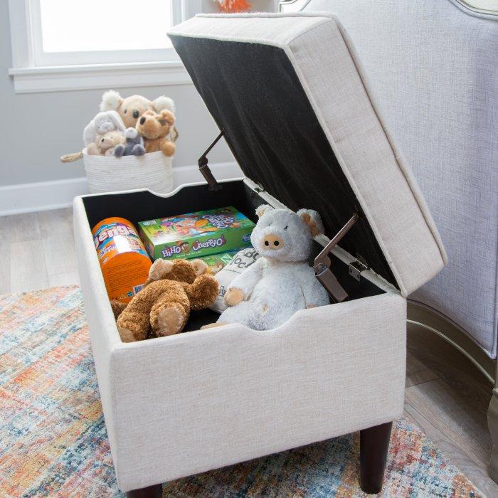 Push the Upholstered Storage Bench up against a sunny window for a makeshift reading nook, or place it at the foot of your child's bed to be used for storing away all those extra toys and games they have lying around their room. This bench is made with a durable hardwood frame and comes upholstered in a tough ivory fabric. Kids can operate the lift-up lid all by themselves without worrying about pinching their little fingers thanks to the safety hinges. Assembly is simple, just attach the included legs and this storage bench is ready for use!