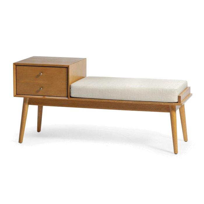 Crafted of rubberwood and birch veneer, this Mid Century Modern Bench is a unique addition to any home. The warm wood finish perfectly complements the cream, 100% polyester upholstery. One large drawer (with a double-drawer face) is perfect for storage of home essentials. The detachable cushion features a hidden zipper closure. The chic mid-century style is ideal for anyone looking to update their home with a fashionable, functional addition.