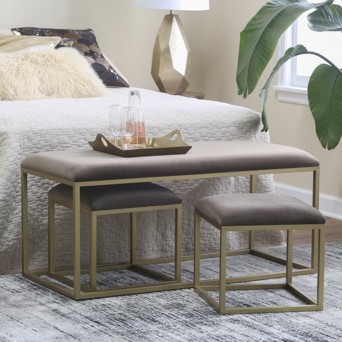 The Modern Nesting Bench and Ottomans proves that fashionable, glam-inspired pieces can be functional as well as stylish. The gold-finished, powder-coated frame gives this set a mid-century modern flair that you'll fall in love with. Upholstered in cool-toned brown, 80% polyester/20% rayon upholstery which perfectly complements the golden frame, this bench and ottoman set will blend seamlessly with most color schemes. Great for small spaces, the two stools nest neatly underneath the bench and can easily be pulled out whenever needed. Place these pieces in your living room, loft, or bedroom to add seating and style to your decor. This set is ideal for anyone looking for an on-trend, comfortable, and functional addition to their home.