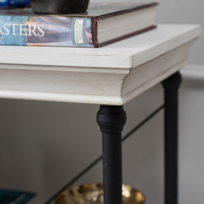 This Bookcase is a versatile piece that accents existing décor well and adds a rustic/farmhouse feel to a room. The top shelf has a subtle tapered edge that creates an elegant detail and leads into the black iron bars that support the piece and provide stability. The unit features an ash wood veneer on its three shelves with a slightly worn appearance. Its open design allows you to display books, seasonal décor, pictures, or other trinkets.