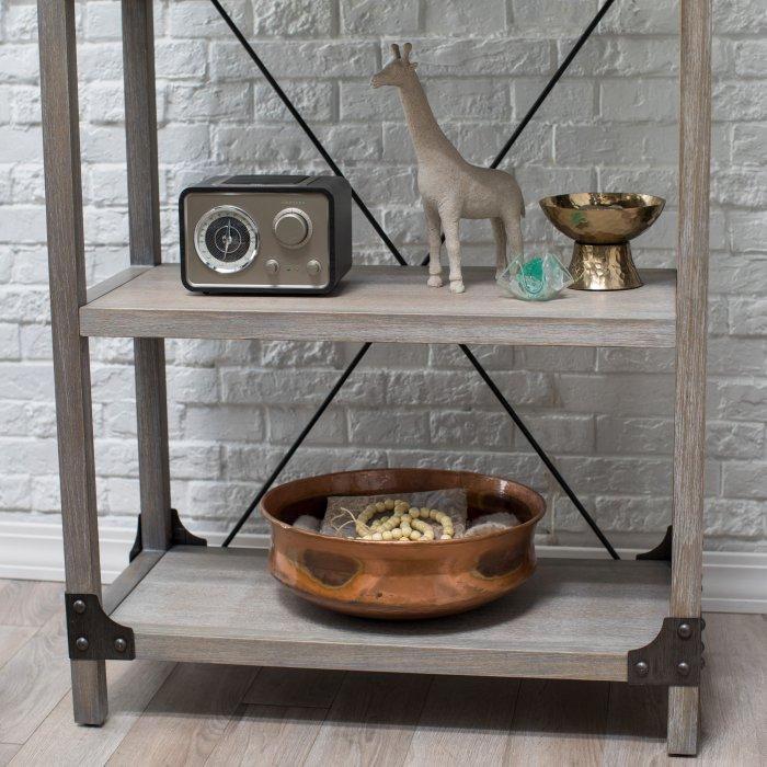 Give your living room some vertical storage space and a rustic air with this Bookcase. Perfect for displaying your favorite decorative items, curios, books, pictures, and even cut flowers, this bookcase boasts five fixed shelves. This bookcase is crafted from poplar and ash veneer to create a strong and sturdy piece that's made to last. The hand-finished iron brackets add an industrial touch while the metal crossing pattern on the back not only adds stability but also completes the look. The soft driftwood finish has understated appeal that allows this bookcase to blend seamlessly with most color schemes. Combine this bookcase with other pieces from the Jamestown collection (sold separately) to create a truly stunning look.