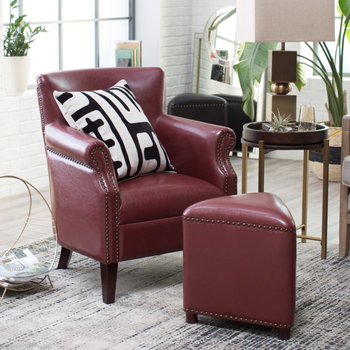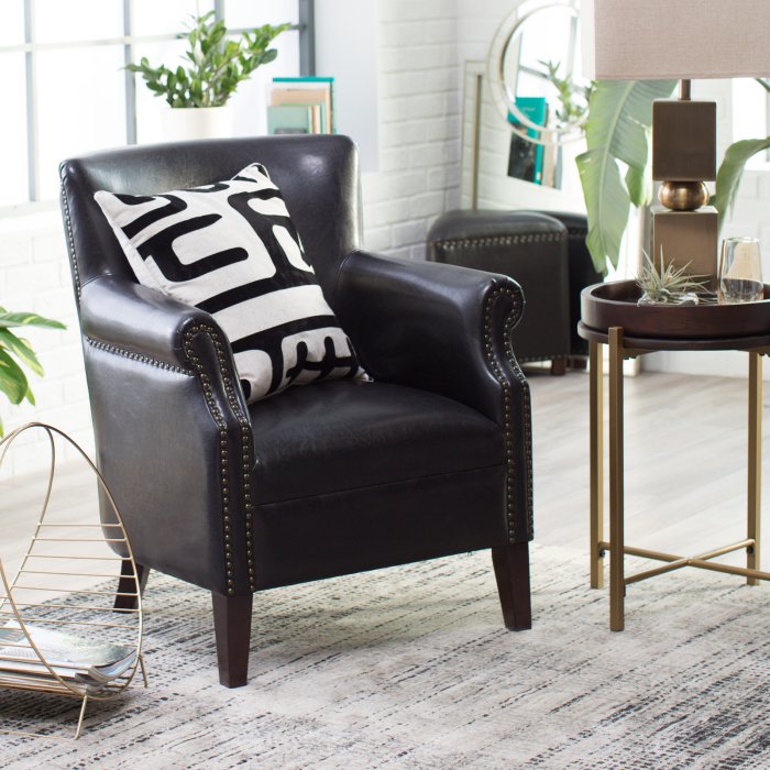Our versatile Arm Chair is a welcoming seating addition to any space. Featuring a poplar wood frame covered in bonded leather upholstery, this classic piece is finished with a stylish nail head trim. Match any décor with one of the available color options. Pair it with other items in this collection to complete the look.