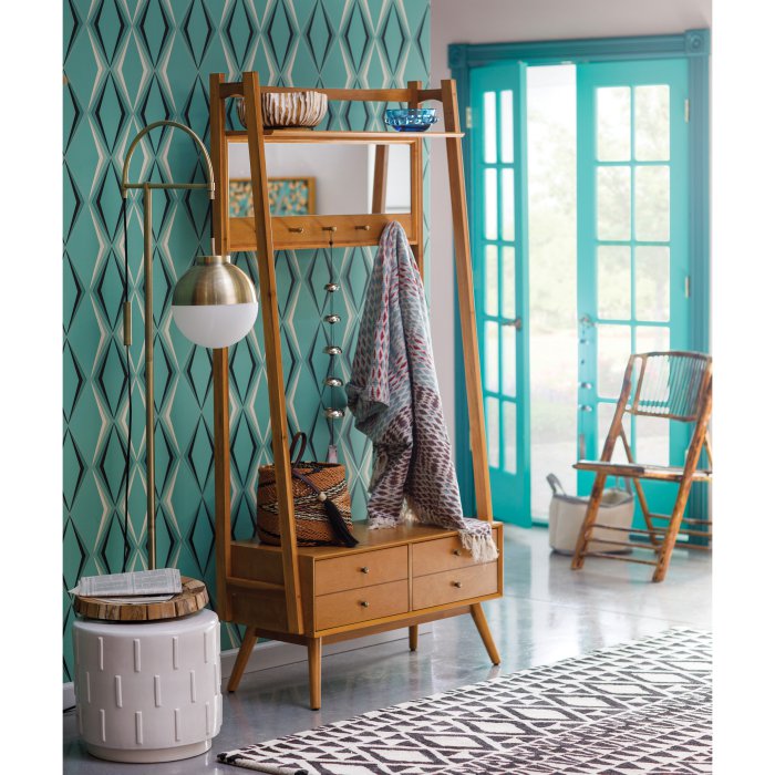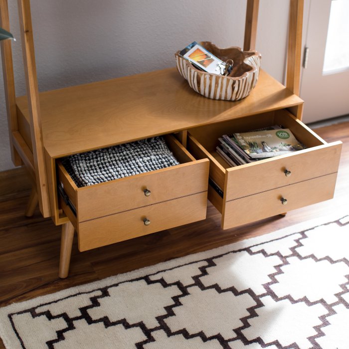 Store your outerwear and accessories in style with the Mid-Century Modern Hall Tree. This space-saving hall tree features two storage drawers and five handy hooks perfect for hanging coats, scarves, and hats, plus a wide pub mirror for last-minute touch-ups on your way out the door. An upper shelf provides even more storage in one compact place. The sturdy birch frame is finished in a clean walnut stain and flaunts the iconic angled legs of mid-century modern design.