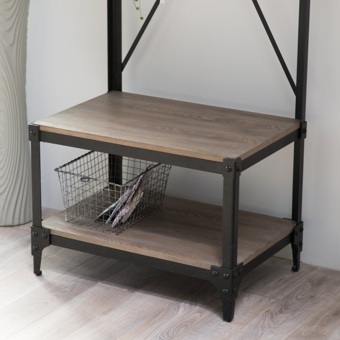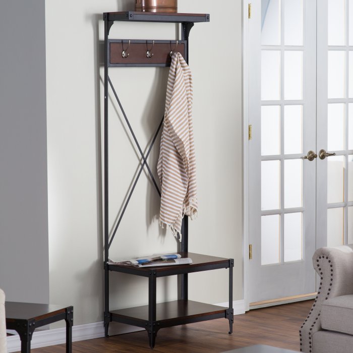 You don't need a contractor or a trip to the hardware store to give your entryway a makeover when you add the Small Entry Hall Tree. This charming and functional piece features a slender metal-framed design that gives you a space for hanging bags, coats, and keys with a great space to sit down and pull on your shoes. The three double hooks have a silver brushed finish that complements the beautiful birch wood veneer in your choice of available finishes. Open shelving also gives you a place to tuck away those items that always seem to clutter up your entryway, and the open design keeps the overall effect from overpowering your space.