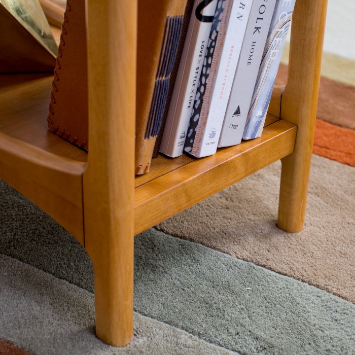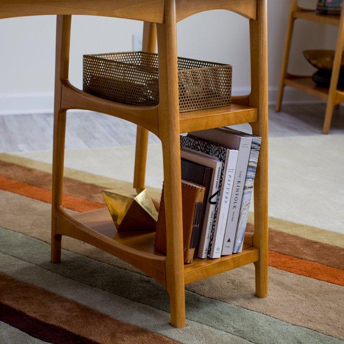 The Mid Century Modern Writing Desk will bring your office back in time to the classic design of the mid-twentieth century. Details like the curving cutouts and angled legs make this desk stand out from the crowd. A total of four open shelves gives you plenty of storage space, while maintaining an open look and feel. Each desk is built with solid poplar wood legs and rubberwood shelves with birch veneers, all in a light pecan brown finish. Some assembly required.