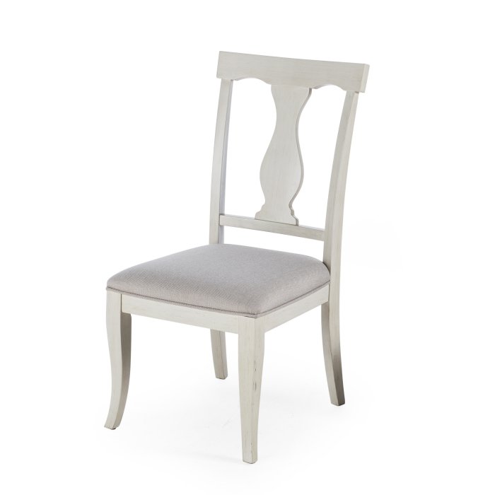 This Solid Wood Dining Chair will transform your dining space into an understatedly charming retreat. Each birch wood chair is upholstered with polyester fabric in a handsome beige color. The antique white finish on the wood and the flared, curved leg and back detailing provide a soothing aesthetic charm. Some assembly is required.