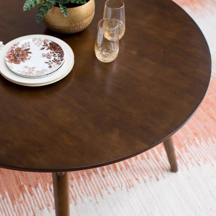Incorporate minimalist modern flair into your dining space with this Dining Table. This handsome piece is made of rubberwood and engineered woods that will last for years of invigorating conversation and fine dining in your home. The walnut finish adds rich aesthetic charm to the table and highlights the thick grains and variegated tones in the wood, while apron detailing provides further visual interest. The traditional round shape will bring your guests closer together for a more intimate experience. Some assembly is required.