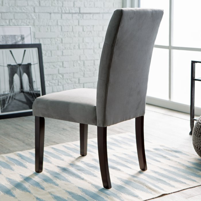 This Palazzo Dining Chair is a decidedly updated take on the classic parsons chair. Distinctive and comfortable, these chairs feature gently flared backs, spacious seats, and an armless design. Sophisticated microfiber fabric upholstery in your choice of color and subtle box stitching add a contemporary spin. Straight legs feature a dark espresso finish for contrast.