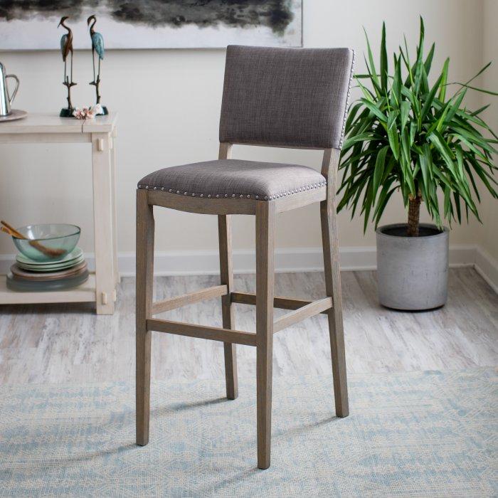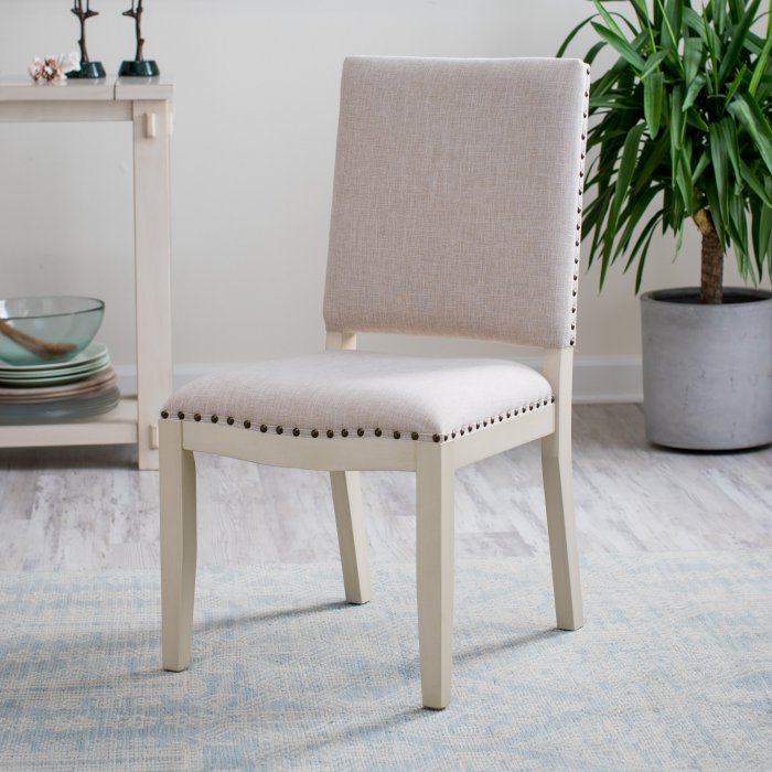 This set of uber stylish dining chairs features solid birch wood construction with durable microfiber upholstery, meaning these chairs will be a part of your home for a long time. Featuring a classic white finish and a homey, burlap texture, these chairs get an extra dose of style from a neatly-applied nailhead trim. With a comfy seat height of 18 inches, these chairs will fit seamlessly with any dining room décor. A little assembly is required.