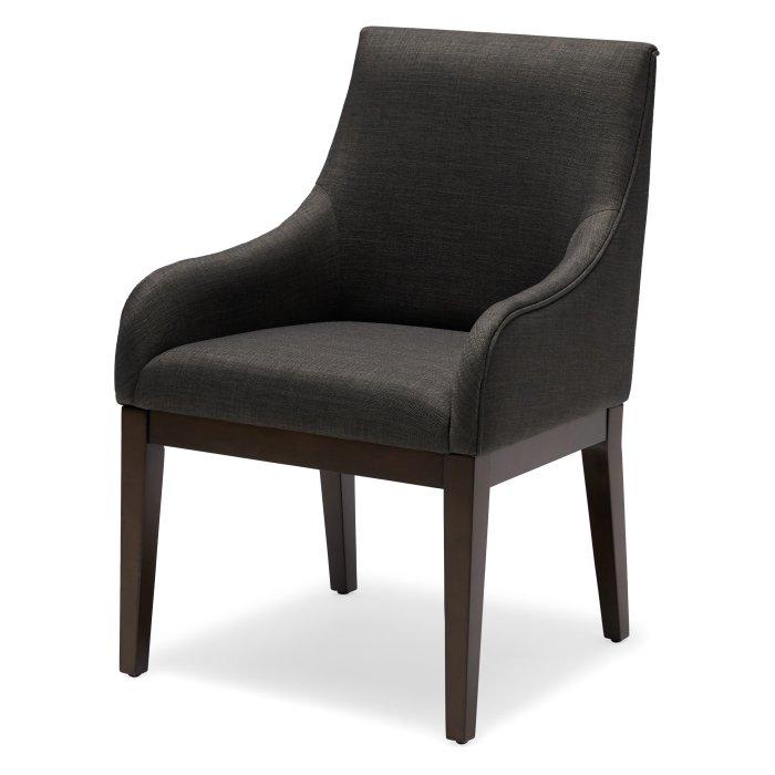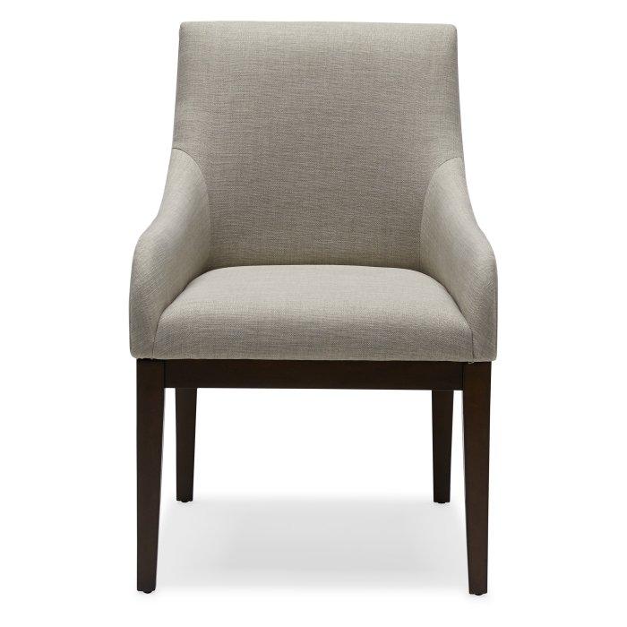 These dining chairs feature solid birch wood frames, and the tapered legs are covered with an espresso finish. The seats are upholstered with easy-care fabric in your choice of available color options. The squared backrest and swooped armrests are outlined with piped detailing for a clean, tailored look. Some assembly is required upon delivery.