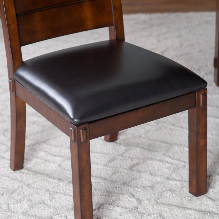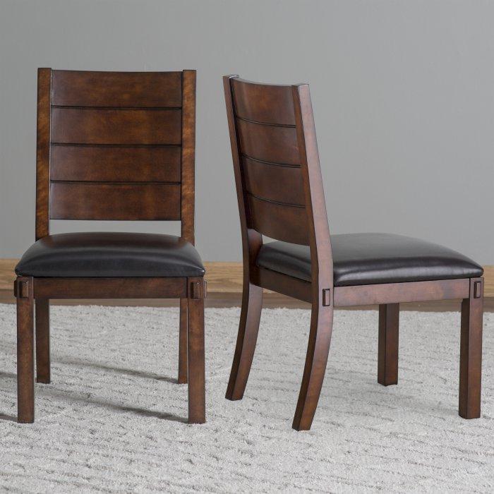 Take a seat at any dining table with the Modern Bonded Leather Dining Chairs- Set of 2. This versatile set of two side dining chairs features durable wood construction in solid birch with an espresso finish. The seat has plush bonded leather upholstery in black for added comfort. A planked chair back adds unique detailing.