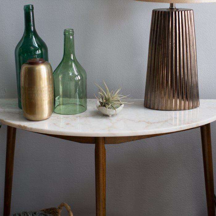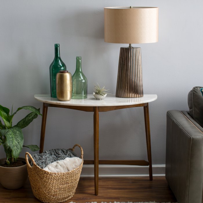 Bring mid-mod glamour into your home with this Half-Round Mid Century Modern Marble Sofa Table. This versatile table is long and lean for a perfect fit in your foyer, hall, or behind the sofa. Tapering solid poplar legs are flared for mid-century appeal. The spacious top on this sofa table is made of luxurious white marble with gray veining. A light walnut finish works with any design aesthetic and contrasts nicely with the white marble. Each table features unique and varying coloration of the marble and may not match the images perfectly.