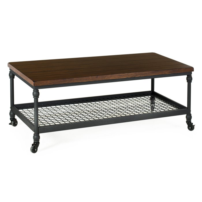 Just because your coffee table isn't the living room's main attraction doesn't mean it has to be boring: with the Archer Industrial Coffee Table, it won't be. Functional caster wheels not only add to the industrial look of the table, they also make it easy to move the table around so you can switch up the look of your living room at a moment's notice. A spacious metal grate shelf on the table's lower half provides storage while also adding to the industrial look. The rich brown wooden tabletop has a plank design that adds warmth and softness to the entire piece. This piece is part of Archer collection. Some assembly required.