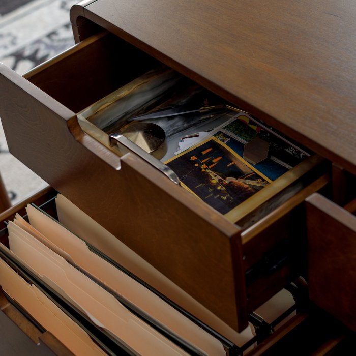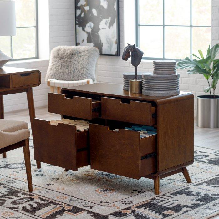 File in style with the 4-Drawer File Cabinet. Clean lines and rounded edges on this filing cabinet, coupled with the deep walnut finish, create fantastic mid-century modern appeal that immediately updates your home office. Replete with four drawers - two can support both legal and letter files while the other two care perfectly for holding pens, pencils, notebooks, and a variety of office supplies, this file cabinet makes getting organized simple. This wide lateral cabinet can also double as a work surface so you don't have to return to your desk for quick tasks. The drawers are equipped with tracks so they glide effortlessly in and out.