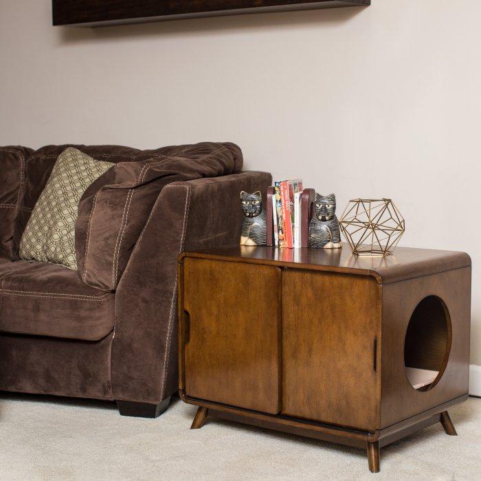 Chic and discrete! This Mid-Century Modern Cat Litter Box will make you rethink the look of litter boxes. Made with quality wood, this piece has a walnut finish. Two sliding doors are included for easy access as well as an entry hole for your cat. The mid-century modern aesthetics give it deceptive style perfect for any space.