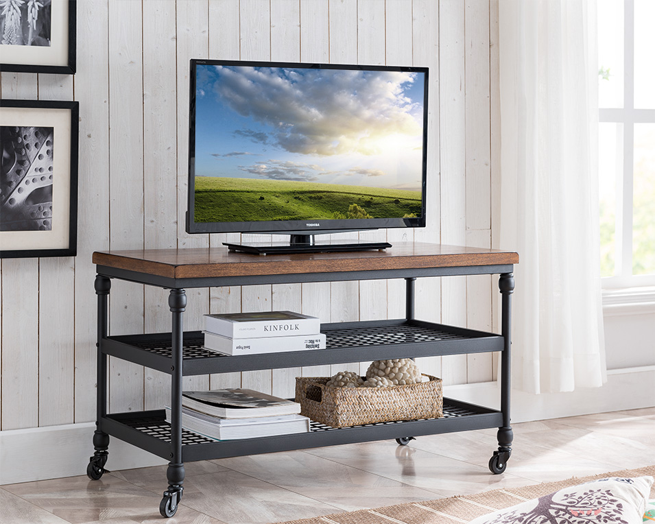 Covington TV Cart with a Charging Station and Metal Shelves is a stylish industrial designed wood and metal frame TV stand that provides plenty of space for today's TV's as well as offering storage for DVD's, electronic components, books, and magazines. Features decorative wheels, 2 metal shelves, and a charging station with 2 USB ports and 2 power outlets.