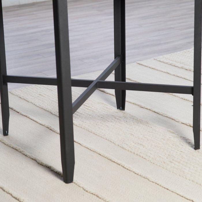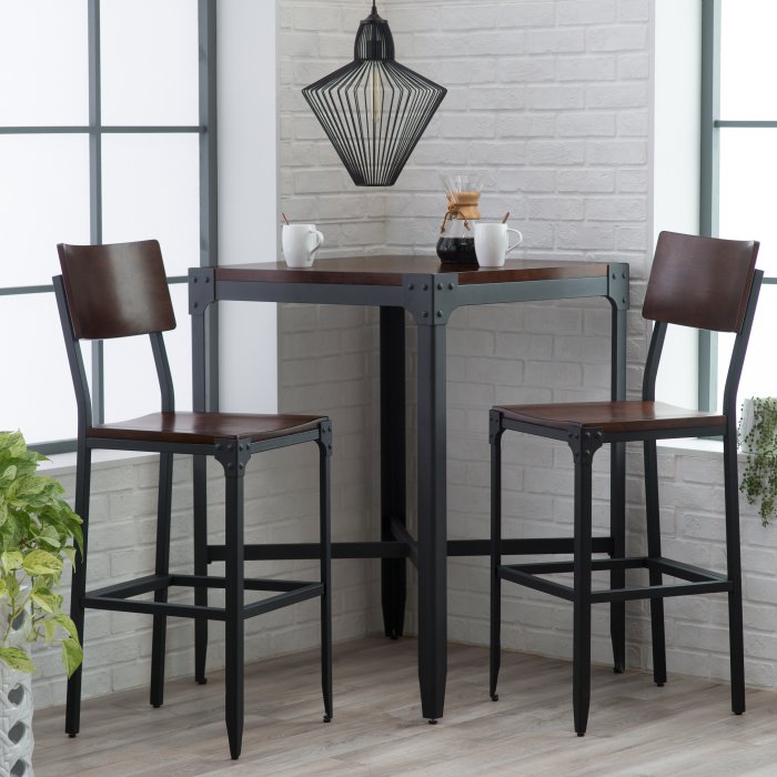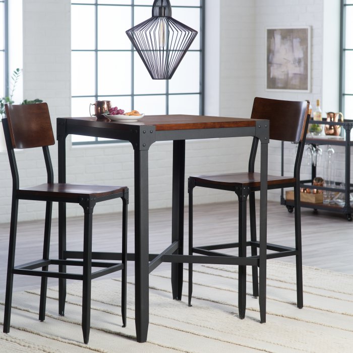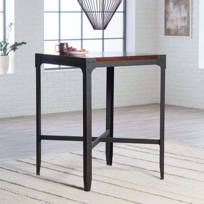 The industrial-inspired Square Pub Table elevates the popular last century vibe. This pub table boasts a handsome wood top in warm espresso finish perched on a black metal frame. Exposed corner bracket hardware, an X stability stretcher, and tapered legs add to the industrial appeal of this pub table.