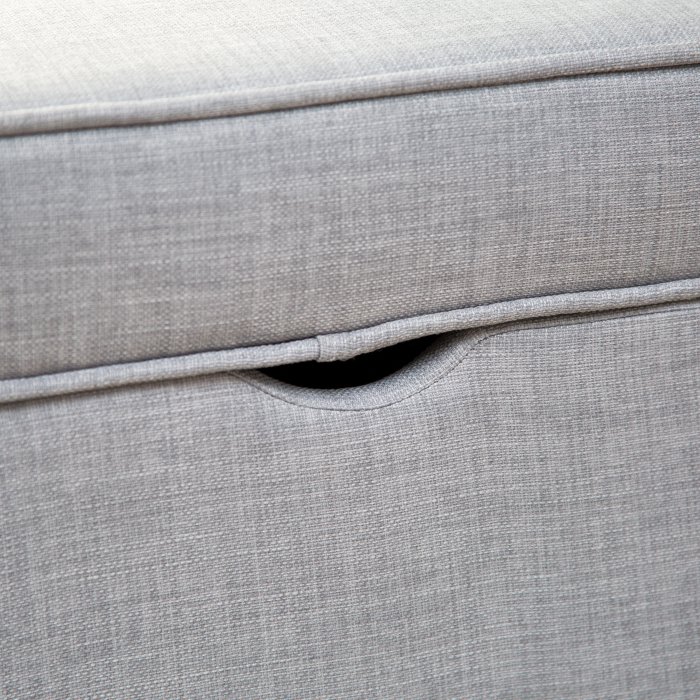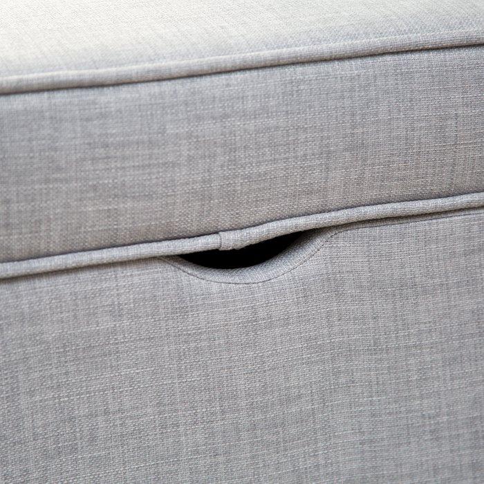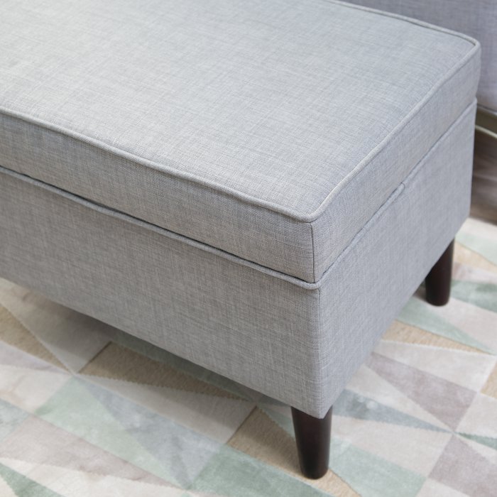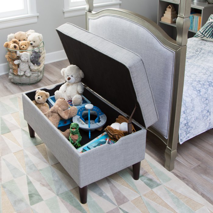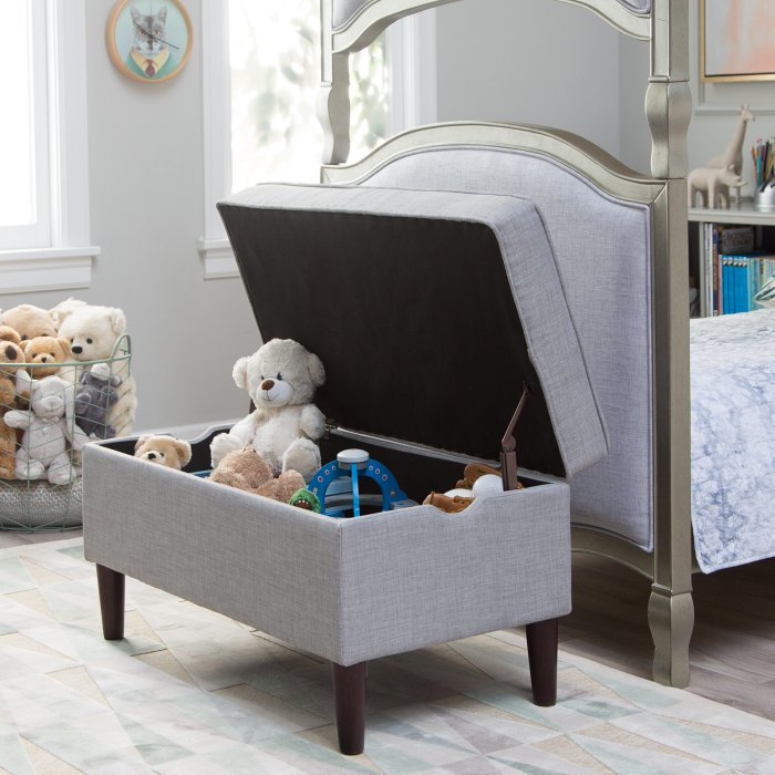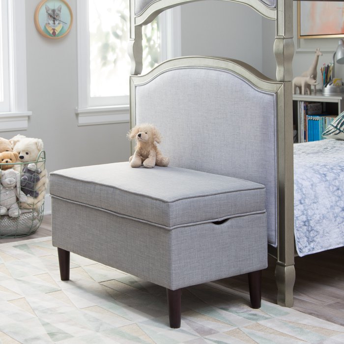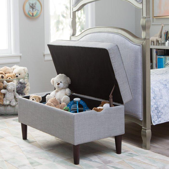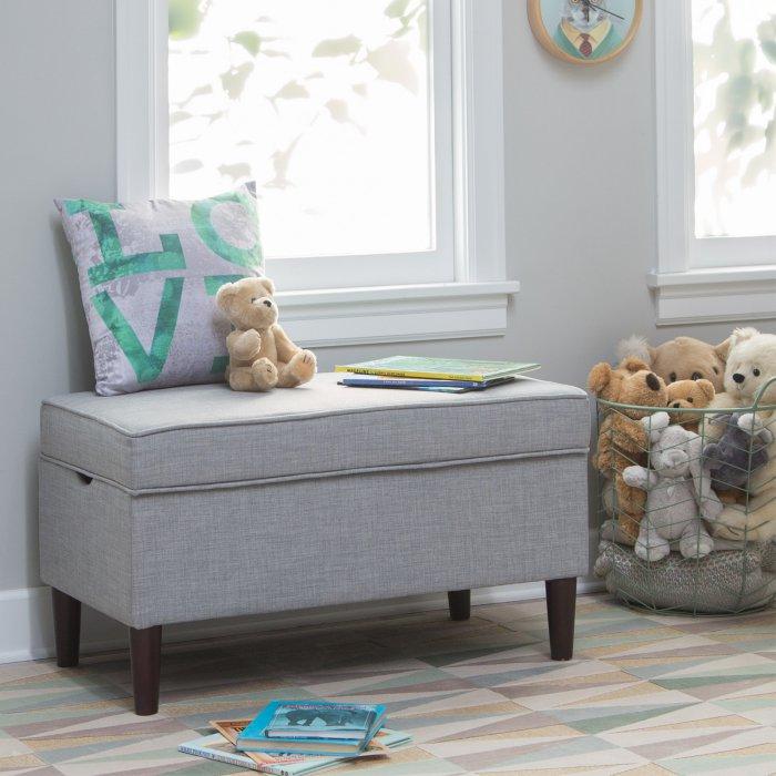 The Upholstered Storage Bench may look sophisticated enough to grace your own bedroom, but this bench was designed with kids in mind. It's made with a durable hardwood frame and comes upholstered in a tough gray fabric. Use the storage space to begin teaching your kids how to clean up after themselves - all they have to do is lift up the lid and drop off their books, toys, and games in the spacious interior. And thanks to safety hinges, you don't need to worry about little fingers getting pinched. Assembly is simple, just attach the included legs and this storage bench is ready for use!