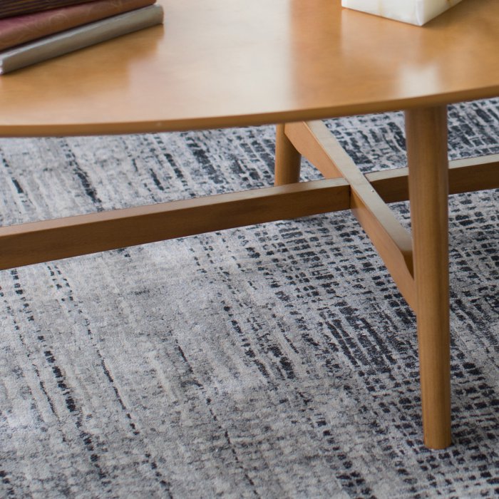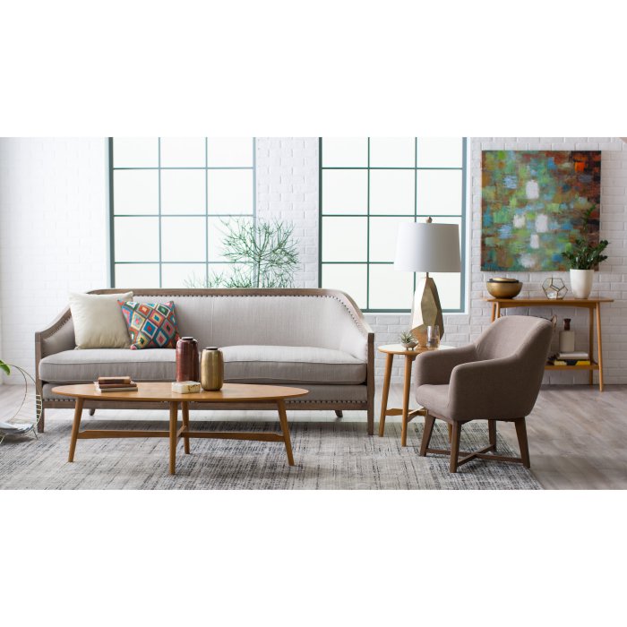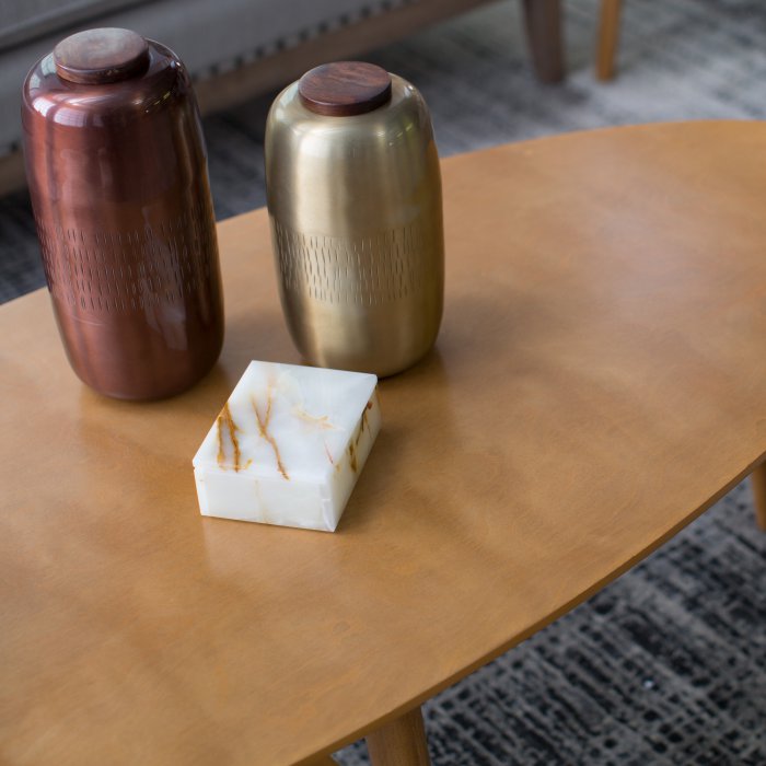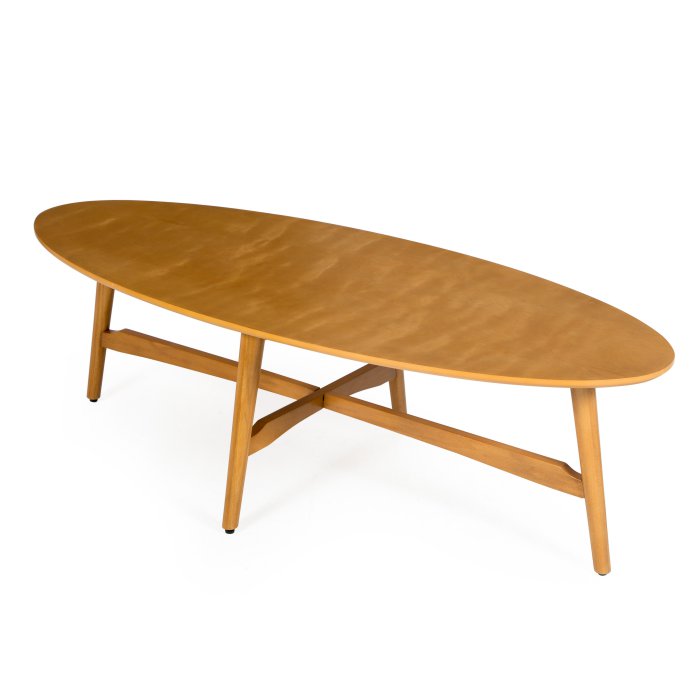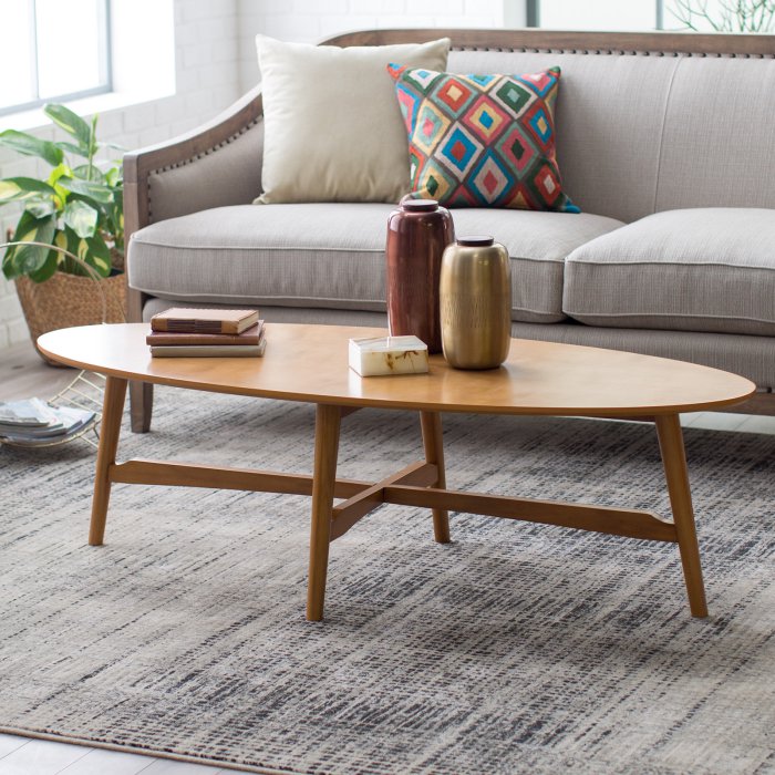 Clean lines and a spacious feel make the Mid Century Modern Coffee Table an essential part of your living room design. A retro darling, this coffee table boasts tapering solid poplar legs that are flared for mid-century appeal. Its generous oval top features birch veneers and offers plenty of room for display pieces and morning coffee mugs. A light walnut finish on this coffee table works with any design aesthetic.